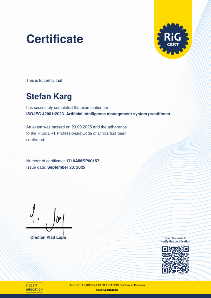 This month I’ve earned the ISO/IEC 42001:2023. Artificial intelligence management system practitioner certification of rigcert.education.
