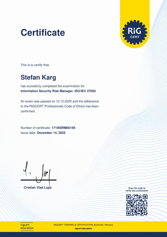 This month I’ve earned the Information Security Risk Manager. ISO/IEC 27005 certification of rigcert.education.